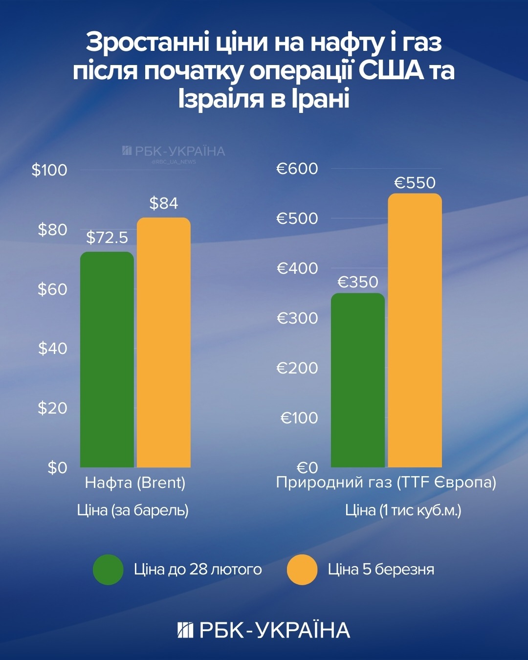 Через війну на Близькому Сході на енергетичних ринках, зокрема і європейських, різко підскочили ціни на нафту і газ. З 28 лютого нафта подорожчала майже на 15% – до 84 доларів за барель, газ – на 60% – до 550 євро за 1000 кубометрів.