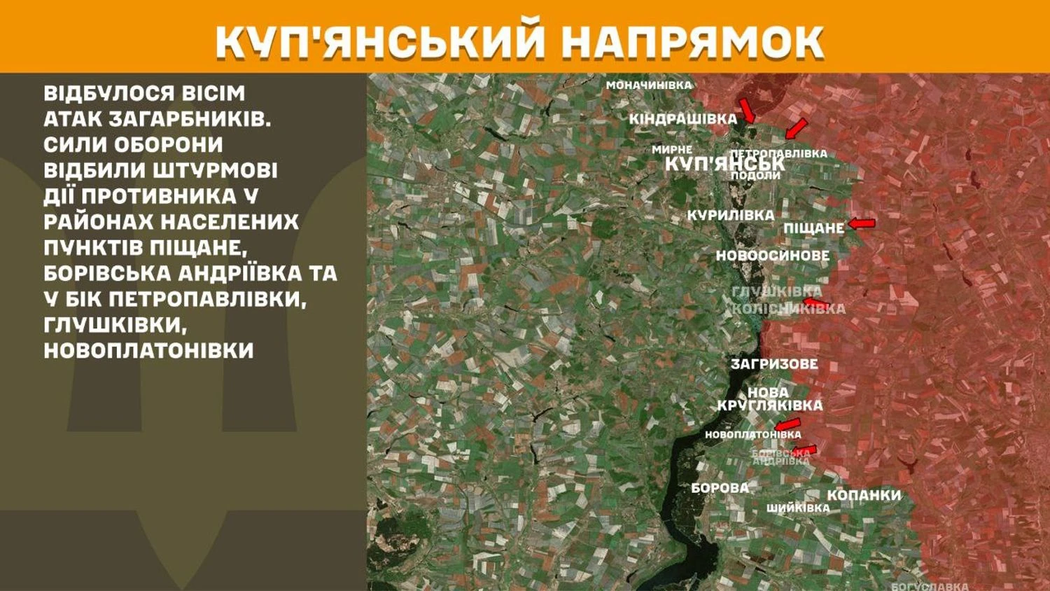 In the Southern-Slobozhansky direction, the enemy stormed the positions of our units 12 times in the areas of the settlements of Starytsia, Vovchansk, Vovchanski Khutory, Rybalchyne, and towards the settlements of Grafske, Okhrimivka, Kolodyazne.