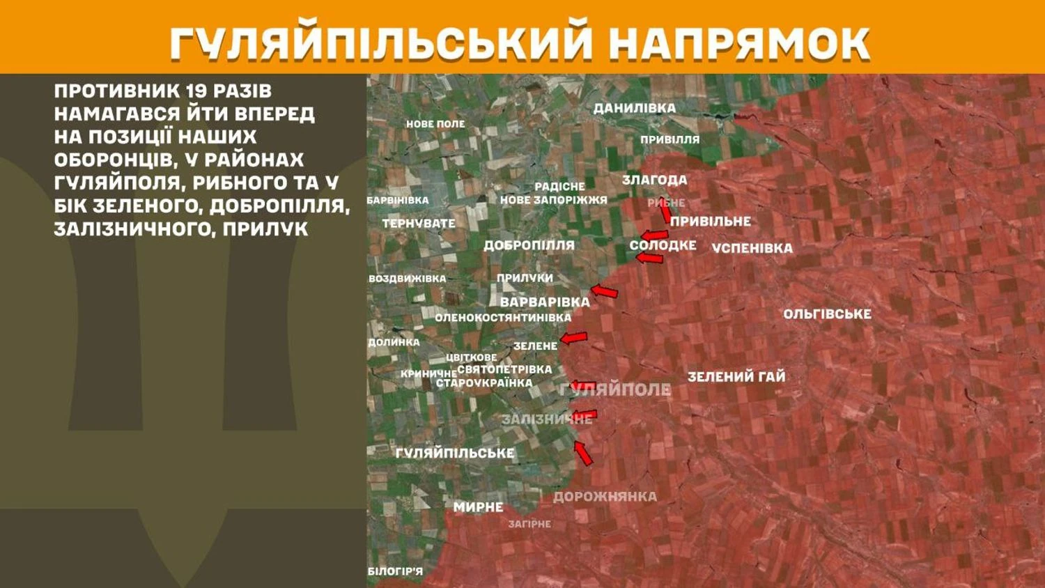 In the Huliaipole direction, the enemy tried to advance 19 times on the positions of our defenders, in the areas of Huliaipole, Rybne, and towards Zelene, Dobropillia, Zaliznychne, Pryluky.