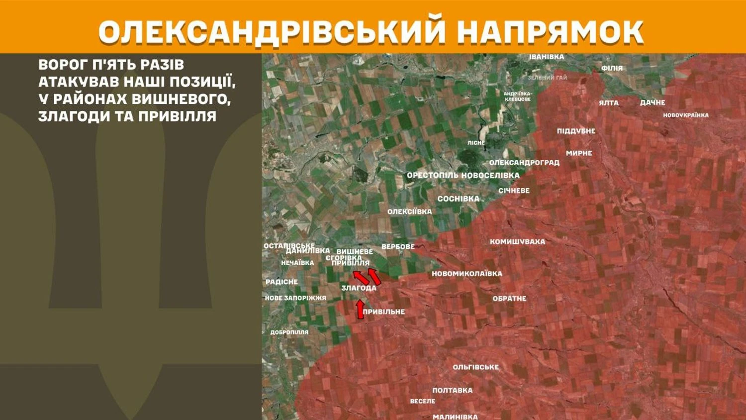 In the Oleksandrivka direction, the enemy attacked our positions five times, in the areas of Vyshneve, Zlahoda, and Pryvillia.