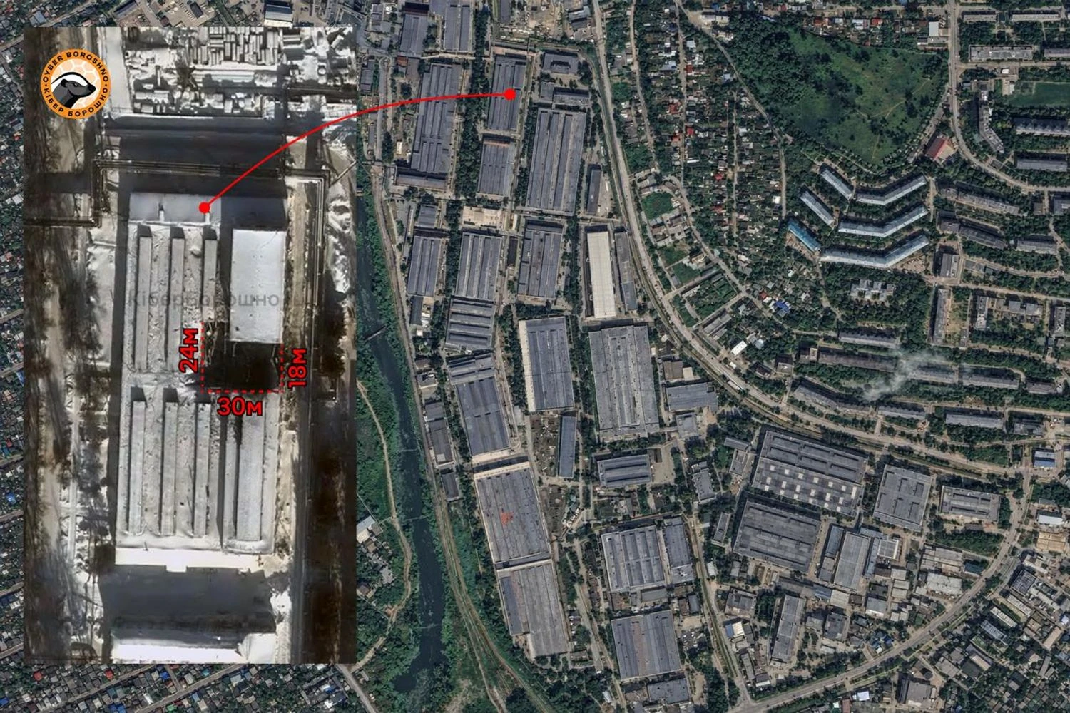 The published satellite images show a hole in the roof of one of the workshops, approximately 30 by 24 meters in size. The height of the damage is uneven – approximately 24 meters on one side and about 18 meters on the other. The nature of the destruction and the configuration of the collapse indicate that the epicenter of the explosion was inside the building. According to analysts, the internal premises of the workshop could have completely burned out.