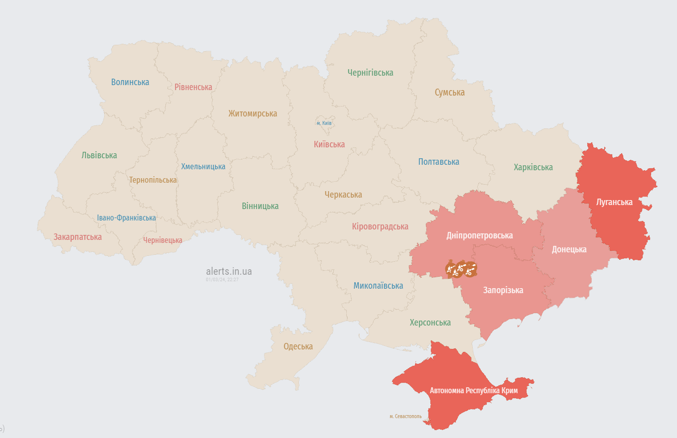 В України ввечері п'ятиці, 1 березня, почали оголошувати сигнал повітряної тривоги. Росіяни традиційно з півдня запустили безпілотники по типу "Шахед".