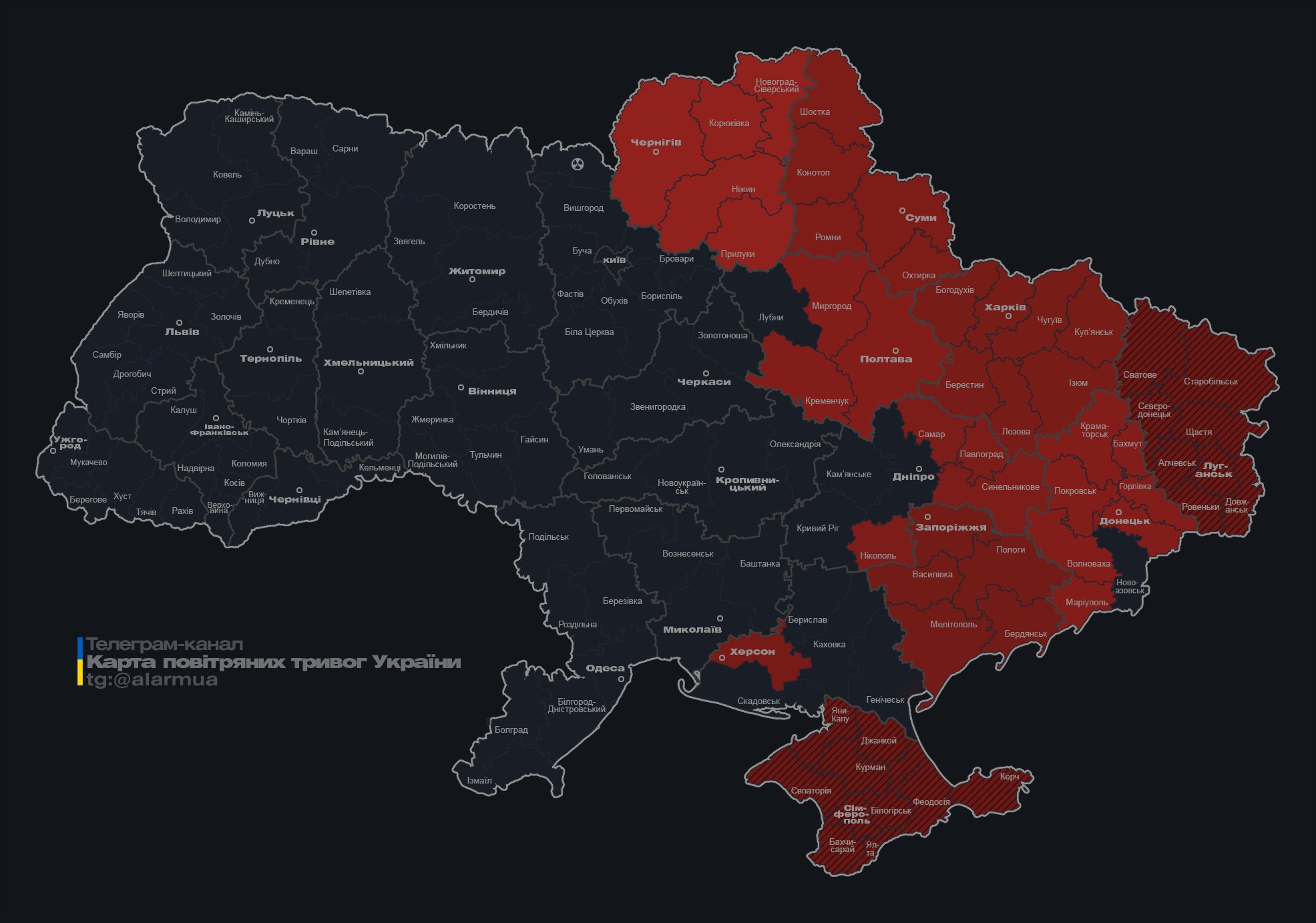 Станом на 23:47 карта повітряних тривог має такий вигляд. Як можна побачити, сигнал продовжується у Полтавській, Сумській, Чернігівській, Харківській, Дніпропетровській, Херсонській, Запорізькій та Донецькій областях.