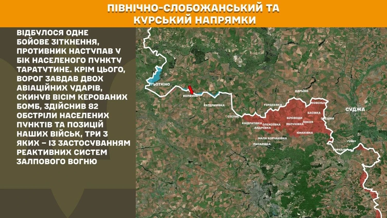 На Північно-Слобожанському і курському напрямках відбулося одне бойове зіткнення, противник наступав у бік населеного пункту Таратутине. Крім цього, ворог завдав двох авіаційних ударів, скинув вісім керованих бомб, здійснив 82 обстріли населених пунктів та позицій українських військ, три з яких – із застосуванням реактивних систем залпового вогню.