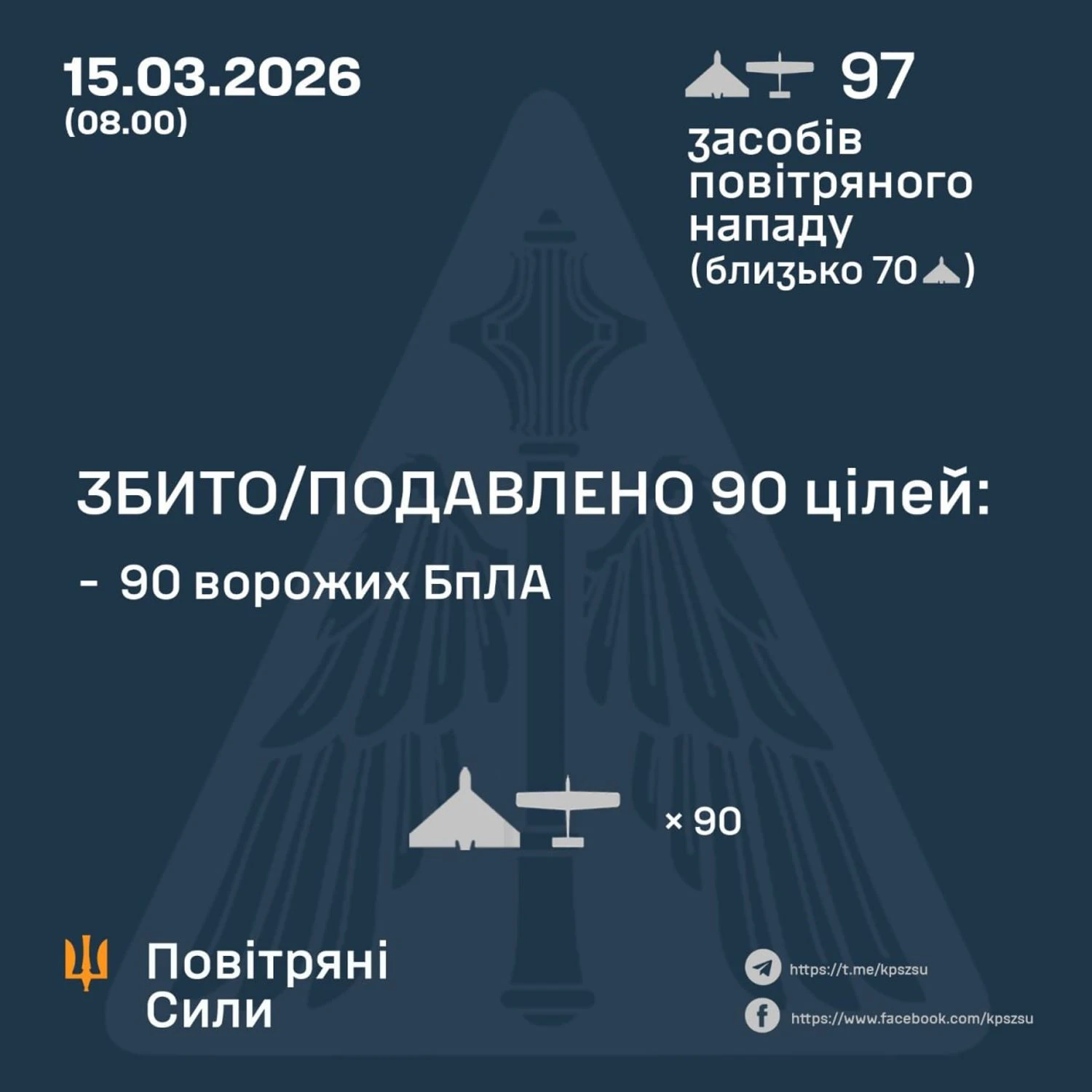 У ніч на 15 березня російські війська здійснили масовану атаку безпілотниками по території України. За попередніми даними, сили протиповітряної оборони знищили або подавили 90 ворожих дронів. Про це повідомляють Повітряні сили, пише УНН.