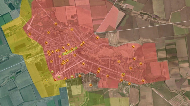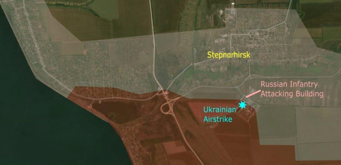 Бої в Степногірську тривають. Український авіаудар спрямований на південний край села. За 150 метрів на північ росіяни атакували будівлю, яку захищали українці.