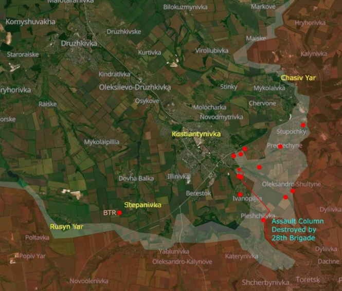 28-а бригада зупинила російську атаку з використанням бронетехніки. Останні російські піхотинці були вбиті неподалік від Костянтинівки.