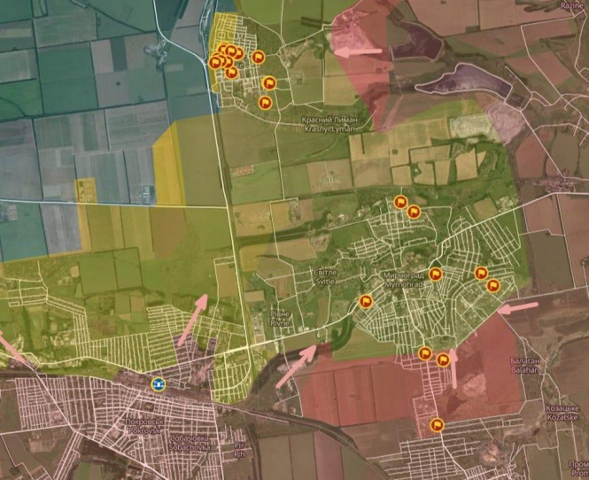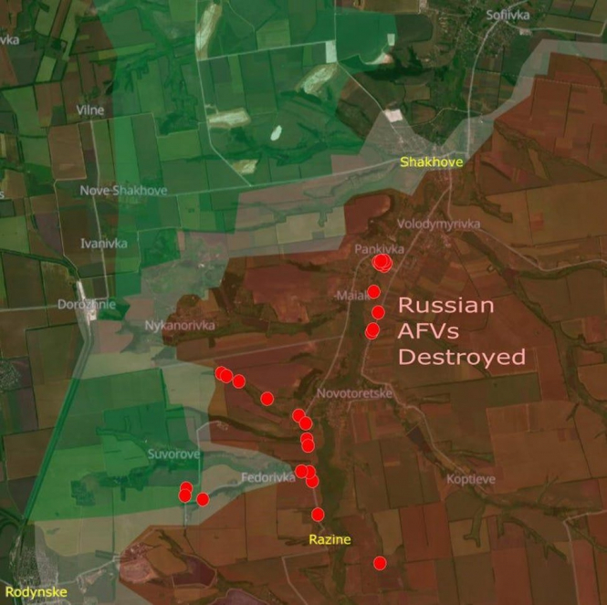 Добропілля. На північ від Разіного, по дорозі до Родинського, російська колона, що складалася з 4 танків, 12 БМП і 5 позашляховиків, була зупинена артилерією і мінами, встановленими дронами. Якщо в будь-якій точці України задіяні бомбардувальні дрони, є ймовірність, що ними керує група Лазара.