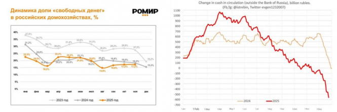 (Ліворуч на графіку) В економіці менше "вільних грошей". Після придбання найнеобхіднішого середня російська сім'я має майже вдвічі менше грошей, ніж два роки тому.