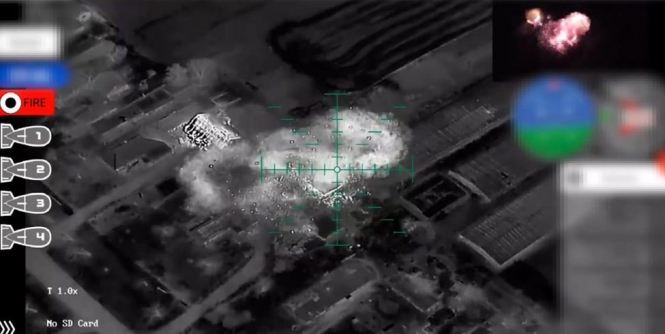 Тепловізійний і оптичний приціли дрона (у правому верхньому куті) фіксують удар по будинку.