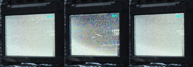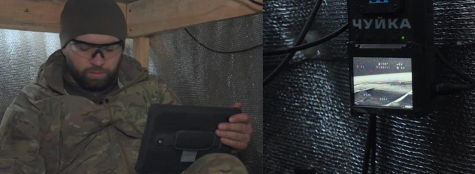 Ліворуч – командир групи перевіряє повідомлення про російські дрони в районі. Праворуч – аналоговий детектор перехоплює відеосигнал, який російські дрони передають своїм операторам. Українська дронова команда бачить те саме, що й російська. У випадку з дронами на оптоволокні це було б неможливо.