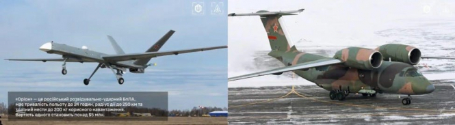 Безпілотник "Оріон" може перебувати у повітрі 24 години під час розвідки. Його дальність – 300 км, стеля – 7,5 км, він може нести 250 кг. Ан-72 – це літак короткого зльоту і посадки (STOL), здатний перевозити 7,5 тонни вантажу або 52 пасажирів. Версія "П" озброєна 23-мм гарматою, а також бомбами та/або ракетами.