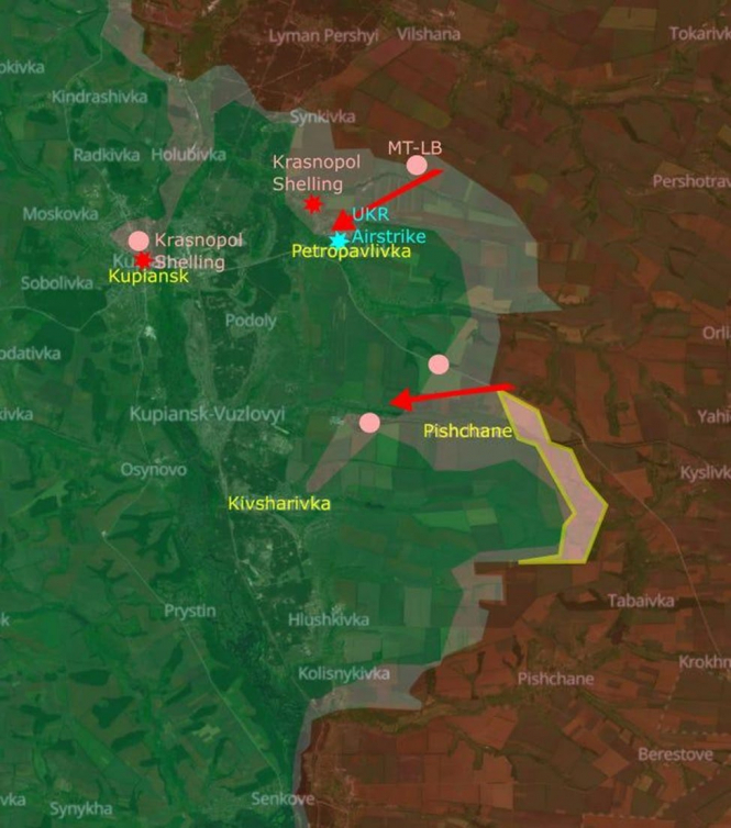 росіяни застосовують артилерійські снаряди з лазерним наведенням у Петропавлівці та Куп’янську. Україна завдає авіаудару по Петропавлівці. Росіяни зазнають удару на північний схід від Петропавлівки.